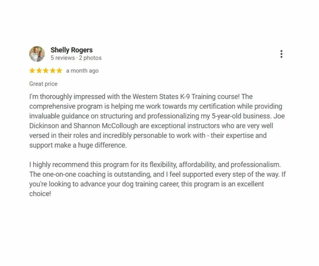 “WSK9CO gave me the confidence and support I needed to finally start my dog training business. I felt guided every step of the way.” - Dina